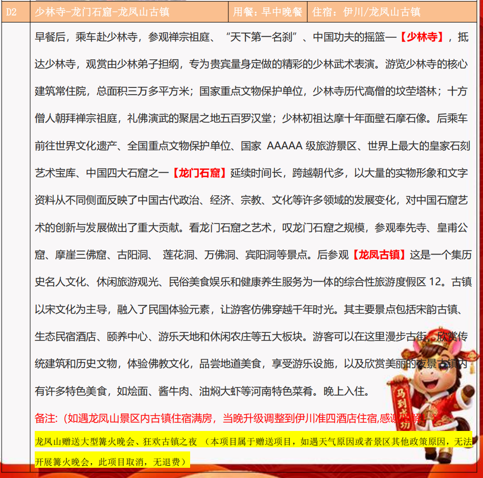 “少林功夫、龙门佛光、老君仙境、古都庙会”四大核心一网打尽,融合了自然、人文、年俗与美食。体验一次深度的中原文化沉浸之旅。