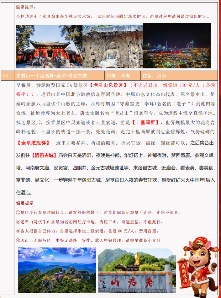 老君山二级索道 80 元/人(自愿乘坐)、少林、龙门耳麦 2 个景区 30/人、白马寺景交 10/人(自愿选