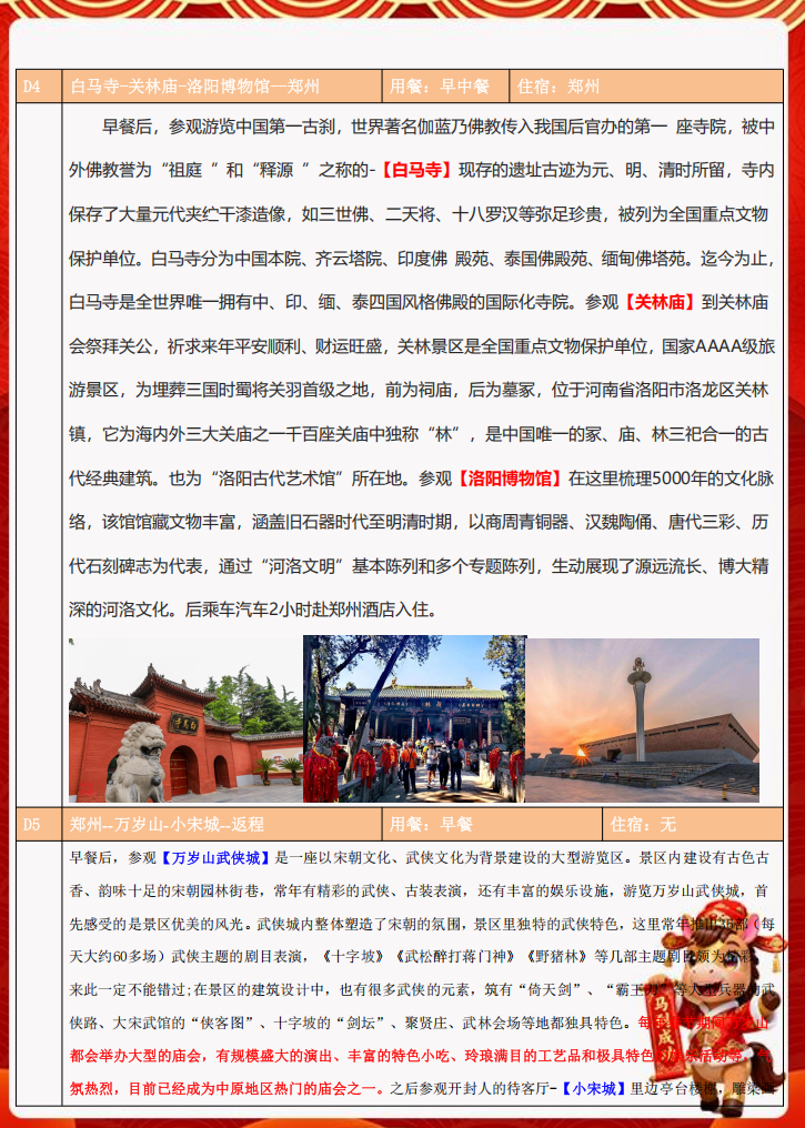 庙会祈福,民俗盛宴:白马寺的清净祈福与关林庙(武财神)的盛大庙会,一张一弛,构成了最地道的洛阳年味。大宋武侠城的实景演出和庙会,让您瞬间化身江湖儿女,体验最欢乐的北宋年俗。亲手触摸的春节仪式感:“在千年古都的团圆夜里,与天南地北的旅人共包一顿‘百家饺’,将新年的福气亲手包进馅里,把中原的暖意吃进心里。”