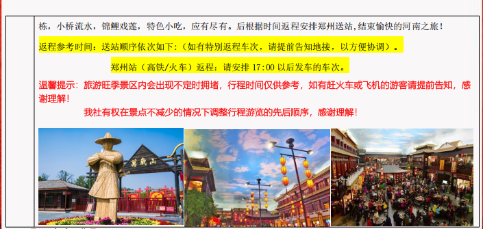 /粥),河南饭菜偏咸,口味较重,请入乡随俗,如实在不合口味,请及时和导游沟通改善,如果确因地方差异造