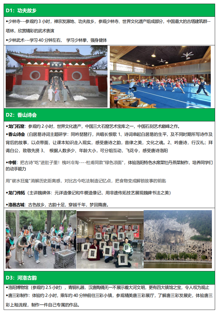 一座洛阳城,半部中国史。这里是李白笔下的"天津三月时,千门桃与李",是王维心中的"洛阳 女儿对门居",更是无数诗人魂牵梦萦的"天下中枢"。让我们带着唐诗泛黄的书页,走进洛阳的街巷、 山水与古迹,在字句间触摸盛唐的温度。 拒绝死记硬背!“来洛阳当小诗人吧!” 我们要让李白、杜甫、白居易—— 成!为!孩!子!的!首!席!爱!豆!” 行程亮点: 诗词+景点——香山诗会,让白居易成为孩子们的导游 文化+体验——用非遗体验来展现文化内涵,原来学诗还可以这么潮 研学+出片---随手拍都是国风大片,朋友圈直接封神